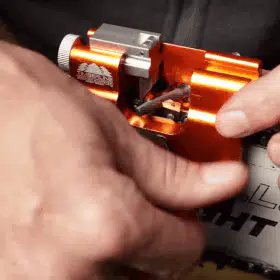 Tão fácil de usar quanto apontar um lápis, basta colocar o grampo na haste, posicionar a lingueta no dente, inserir a broca na manga guia e girar a alça.