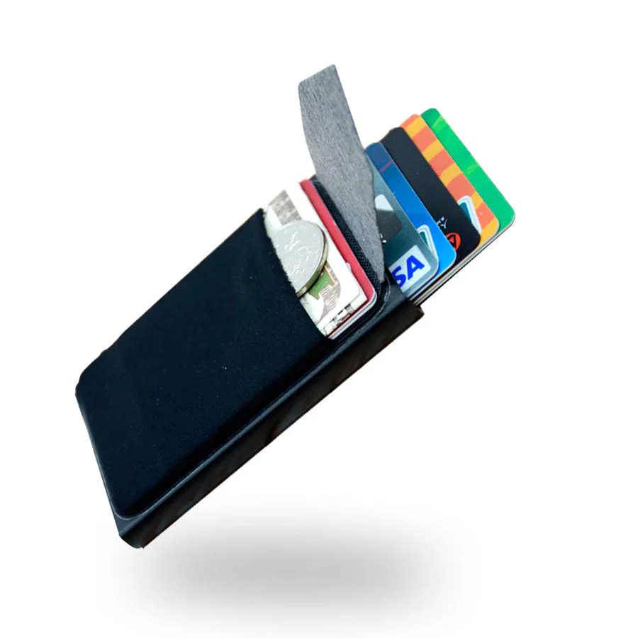 A Carteira de Alumínio não se limita a só parecer uma carteira luxuosa. Ela mantém seus cartões de crédito seguros - e eles saltam instantaneamente ao pressionar o botão na parte inferior da carteira!