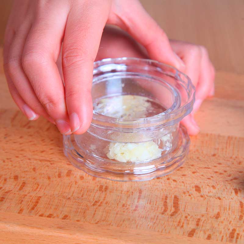 Tenha os mesmos resultados que obteria com um espremedor de alho, porém mais rápido e podendo espremer vários dentes de uma só vez.